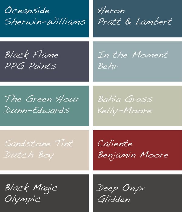 In general we seem to be moving away from the everything-in-white trend and toward moodier, more introspective hues. Shades of black are in, as are watery blue-greens. I was expecting to see hotter hues dominating the field this year, but the only warm contenders are a bold red from Benjamin Moore and a soft tan from Dutch Boy.