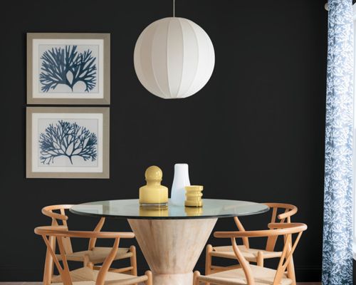 <b>6.</b> For those looking to go to the dark side, Glidden’s selection, Deep Onyx, is an almost black that packs a punch. Use it sparingly in spaces that don’t get much natural light. It’s super chic in this dining space.